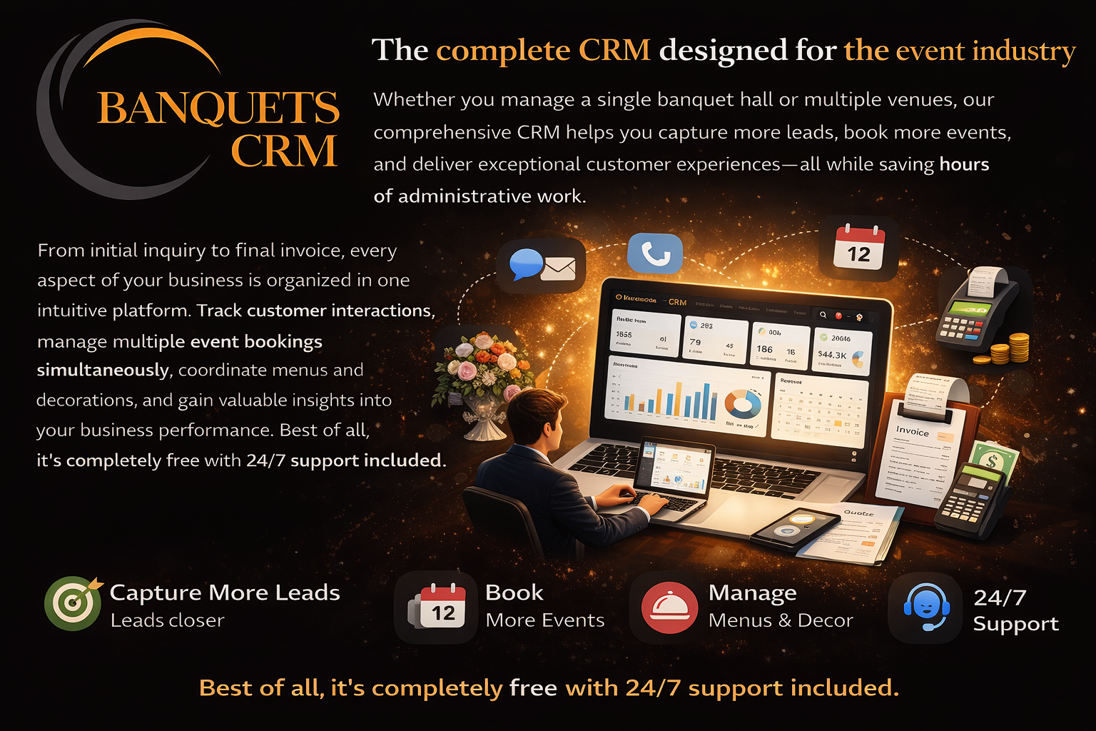BanquetsCRM launches as a 100% free CRM for banquet halls, wedding venues, and event spaces. Manage leads, bookings, customers, menus, quotations, and invoices from one simple dashboard with no subscriptions and no hidden costs.